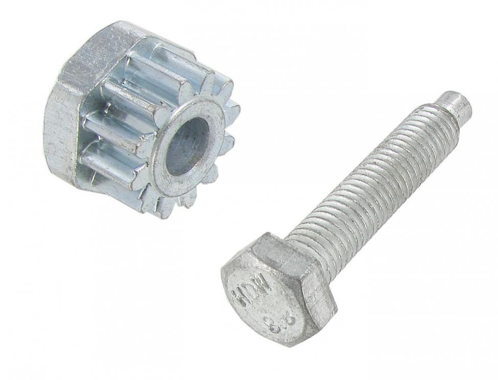 The alternator is lightly tightened with the special M8 bolt, after which the V-belt is tensioned by turning the sprocket; once the correct tension has been reached, the bolt is tightened again to lock the assembly in place.