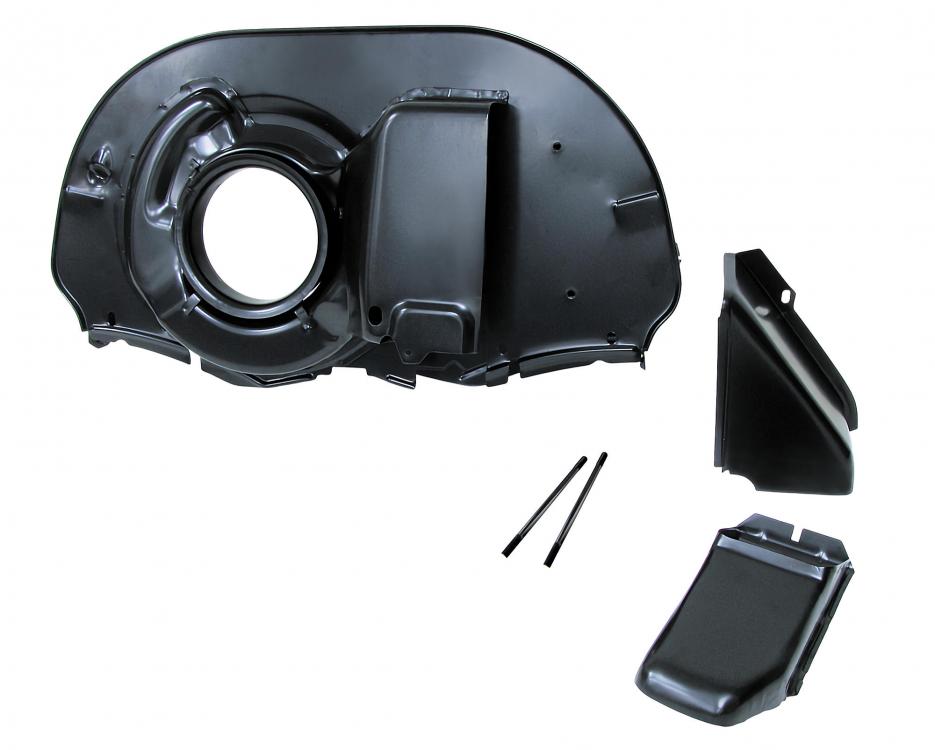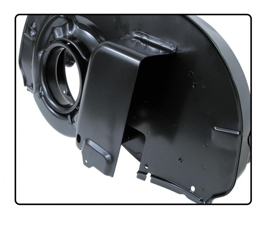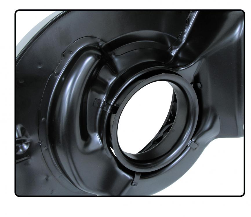 The shroud comes with a two-piece oil cooler cover and longer threaded studs for correct mounting of the Type 4 oil cooler on the original Type 1 oil cooler bracket. The internal air guides are precisely reproduced to VW's original design, ensuring optimum cooling air distribution. In addition, the shroud is equipped with an air guide ring that further optimizes air flow to the oil cooler and cylinders.