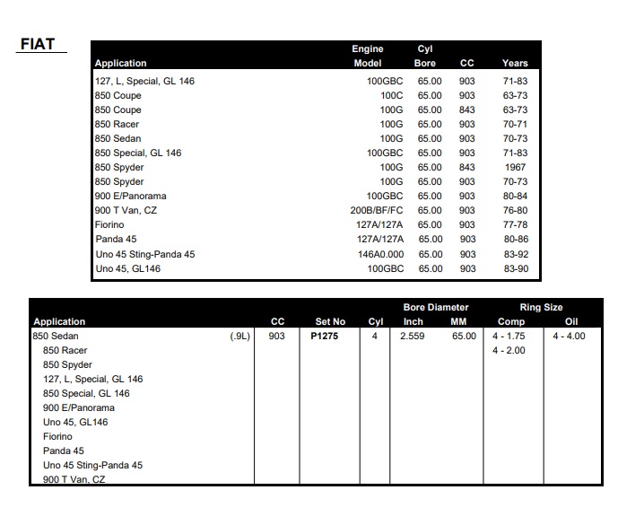 Set of moottori piston rings Fiat OHV moottori