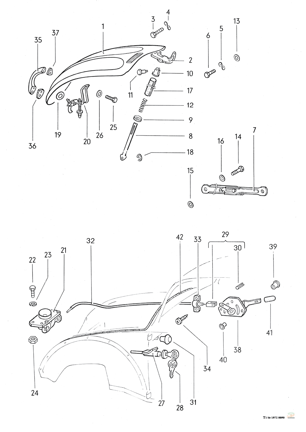 Tätä kaapelia käytetään tavaratilan tai moottorin kannen lukituksen avaamiseen. Suosittelemme, että tarkistat sen toiminnan säännöllisesti. Jos vaijeri ei enää toimi kunnolla, tarkista ja mahdollisesti vaihda sisempi vaijeri. Tämä on erityisen tärkeää elokuun 1968 Volkswagen TYP-1 Kupla -mallissa: jos vaijeri katkeaa tavaratilan ollessa kiinni, sitä ei voi avata sahaamatta kahvaa!
