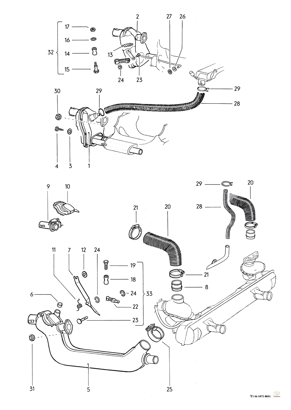 Tyypin 1 moottorin vakiopakoputkisto on varustettu välilämmönvaihtimen kiinnikkeillä, jotka yhdistävät lämmönvaihtimet puhaltimeen liitettyihin lämmitysputkiin. Tätä periaatetta sovelletaan myös joihinkin urheilupakokaasujärjestelmiin, kuten Sporty ja Classic Performer, jotka perustuvat alkuperäiseen. Nämä leveät kiinnittimet yhdistävät välilämmönvaihtimet päälämmönvaihtimiin. Jos niitä ei ole liitetty kunnolla, ilmavirtaus katkeaa, mikä vähentää lämmöntuottoa. Nämä puristimet sisältyvät vakiona suurempaan pakosarjaan, mutta niitä on saatavana myös erikseen, joten sinun ei tarvitse ostaa kokonaista sarjaa pelkkien puristimien takia. Jos haluat käyttää näitä kiinnittimiä muuhun sovellukseen, ota huomioon 23 mm:n leveys ja 50-55 mm:n kiinnitysalue. Seuraavat toimitetaan pareittain