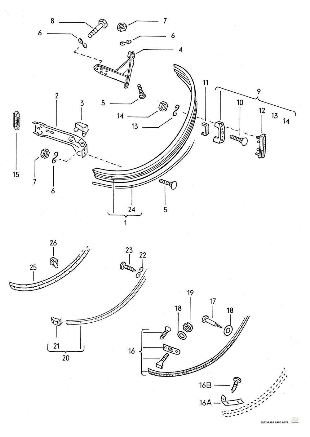 Bij Volkswagen Kevers van latere bouwjaren zijn deze kunststof delen gemonteerd op de achterbumper. Bij de Karmann Ghia’s tot en met modeljaar 1971 zijn het rubbers die zowel aan de voor- als achterbumper aanwezig zijn. Aan de voorzijde bestaat het per zijde uit een tweedelig rubber, terwijl het aan de achterzijde per zijde uit één geheel bestaat. In tegenstelling tot de VW Kever worden de rubbers bij de Karmann Ghia gemonteerd tussen het uiteinde van de bumper en het spatbord.