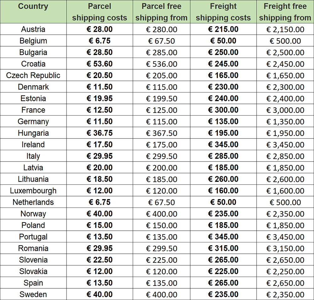 In sommige landen hanteren we vaste verzendkosten (zie onderstaande lijst), voor alle andere landen worden de verzendkosten automatisch berekend op basis van de afmetingen en het gewicht.