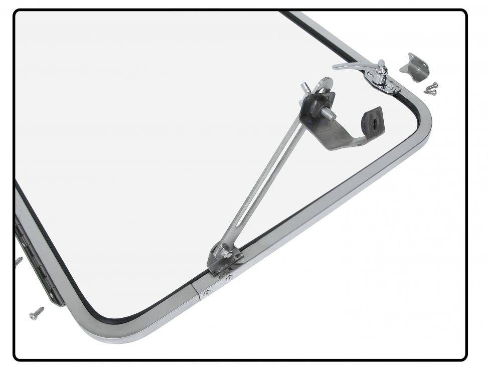 - twee scharnierende RVS voorruitframes met gemonteerde beglazing