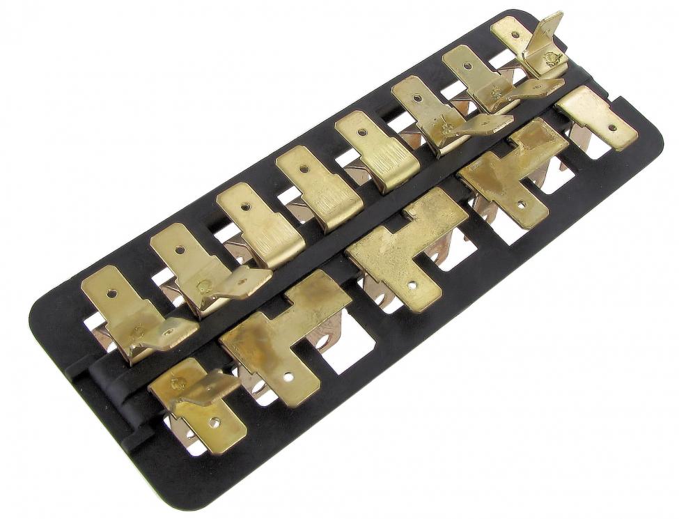 Opmerking: Bij de zekeringkasten die zijn voorzien van een deksel die met een centrale sluitingsbout wordt vastgezet, zijn er geen verbindingsbruggen aan de onderzijde aanwezig. Maak deze zelf van een koperen stripje zoals origineel of eenvoudig met een draadoverbrugging.