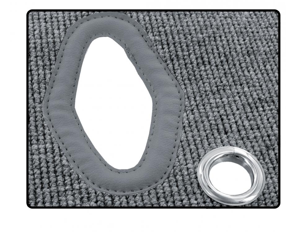 Os orifícios para o travão de mão e para a mudança de velocidades são cosidos com vinil da mesma cor que o tapete, bem como a parte de proteção dos pés junto ao pedal do acelerador. Se o seu VW Carocha tiver uma abertura para aquecimento, o recorte é rematado com um anel de aço inoxidável e os bordos exteriores são forrados com algodão