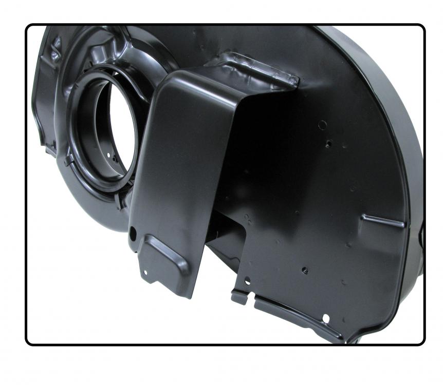 Täckkåpan levereras med ett tvådelat oljekylarlock och längre gängade pinnbultar för korrekt montering av oljekylaren av typ 4 på originalfästet för oljekylaren av typ 1. De invändiga luftledarna är exakt reproducerade enligt VW:s originaldesign, vilket ger optimal fördelning av kylluften. Dessutom är kåpan utrustad med en luftledningsring som ytterligare optimerar luftflödet till oljekylaren och cylindrarna.