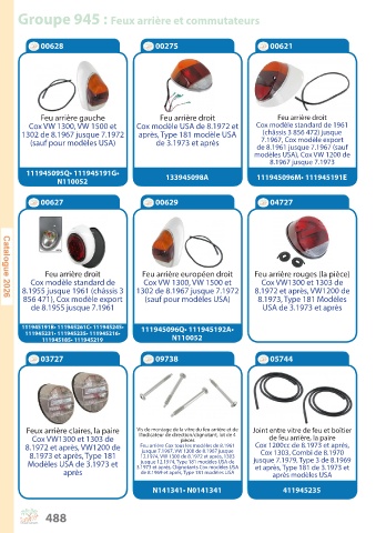 8.1972 et après, VW1200 de Feu arrière Cox tous les modèles de 8.1961 Cox 1200cc de 8.1973 et après,