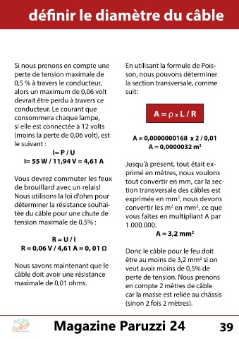 R = 0,06 V / 4,61 A = 0, 01 Ω Donc le câble pour le feu doit